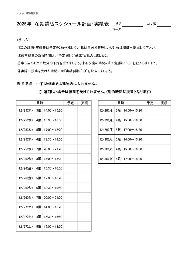 実際に受講する際は、下記の予定表に自由に予定を立てて、冬期講習最終日の12/30(火)までに申し込んだコマ数分受講してもらいます。